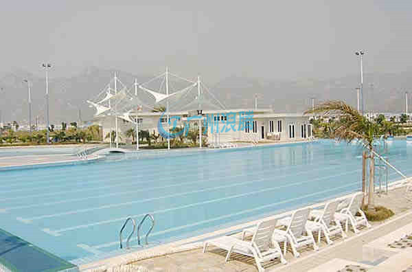 標(biāo)準(zhǔn)游泳池長50米,寬21米,奧運會世界錦標(biāo)賽要求寬25米,另外還有長度只有一半即25米的游泳池稱為短池。水深大于1.8米。有8個泳道,每道寬2.5米,邊道另加0.5米。出發(fā)臺應(yīng)居中設(shè)在每泳道中心線上,臺面50厘米×50厘米。臺面臨水面前緣應(yīng)高出水面50至70厘米,臺面傾向水面不應(yīng)超過10度。游泳池的池岸寬一般出發(fā)臺端不小于5米,其余池岸不小于3米。正式比賽池,出發(fā)臺池岸寬不小于10米,其他岸寬不小于5米。國際也有25米游泳池的比賽。